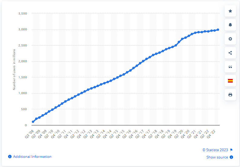 According to Statista statistics, as of the first quarter of 2023, the number of Facebook users has reached nearly 3 billion monthly users, of which 67.5% of monthly users are active daily.